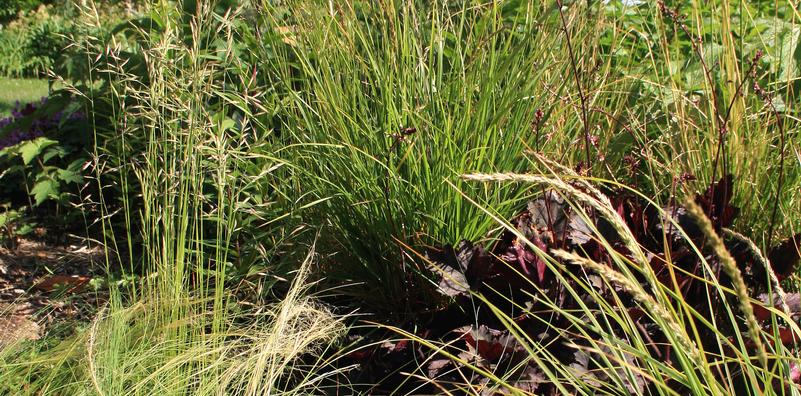 On a large scale, grasses make up the most dominant biome worldwide, with grasslands serving as important habitats for the critters that live there and also aiding in erosion control and bioremediation in areas where soil has been degraded or disturbed. On a smaller, local scale, grasses provide a range of textures to the landscape, from their fine to strappy blades, and large-and-fluffy to delicate-and-mist-like inflorescences. This is evidenced in the finely textured, nearly hairlike leaves and stems of Nassella tenuissima, topped with threadlike inflorescences, which create a truly mesmerizing visual billowing in a soft summer breeze. Known commonly as Mexican feathergrass, this Southwestern native is stunning planted en masse in the rock garden, or mingling amongst brightly colored, boldly textured early summer blooms. The threadlike, silvery-white inflorescences gleam in the moonlight, providing an unexpected, fine texture in the nighttime garden. Its drought tolerance makes it a favorite of those with xeriscaping, and ability to self-seed readily in the landscape makes it a dutiful volunteer capable of filling in odd gaps where other plants may have difficulty establishing.