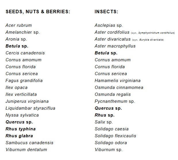 Attached is a list of native plant species that directly support tufted titmice, providing forage material throughout the year, whether it be of the photosynthesizing or crawling variety. Ready to team up with the tufted titmouse? Add these selections to your next order to start building your titmouse temple!