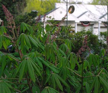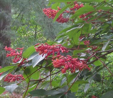 The Red Buckeye is named for its striking showy 5" red upright flower panicles, which appear on the ends of its branches in May. Aesculus pavia's foliage is dark green in summer, turning to yellow in early fall. It produces the lustrous brown chestnuts that we all loved as children and squirrels go crazy for them. It can be grown as a very large wide shrub or as a small slow growing tree.