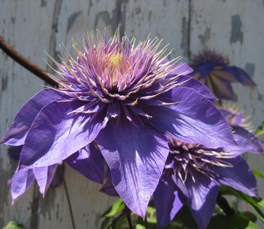 Clematis 'Multi-Blue' has large dark blue to purple flowers which are double, made even showier by the frilly white tipped stamenoids. Blooms for an extended time starting in June and the flowers persist longer because they're double and therefore sterile.