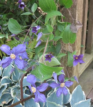 Clematis durandii has deep blue flowers of 4 petals with creamy, showy anthers, on a non-clinging, scrambling vine. Blooms July and August. Unusual and very striking.