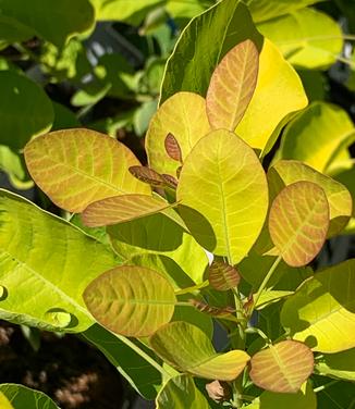 Winecraft Gold® (‘MINCOJAU3’) Smokebush was bred in France by Corinne Liquiere. The neat round leaves emerge in orange to chartreuse shades, maturing to lime green by mid summer. Cotinus coggygria Winecraft Gold® is crowned with greenish pink smoke-like inflorescences in early summer on old growth, so do not prune in spring. The habit is compact and the fall foliage is a clean yellow. Winecraft Gold® is more scorch resistant than earlier yellow cultivars.