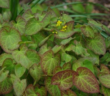 'Frohnleiten' Barrenwort has butter yellow flowers with good strong color in April and May. It does well in dry shade and is semi-evergreen. The new leaves have red veining in spring, which shows up again in the fall.