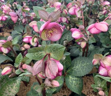 Frostkiss® Glenda's Gloss® ('RD25') Lenten Rose blooms from January through March producing large white blooms with broad purple margins. The foliage is also attractive, with silver mottling overlaying the lustrous deep green evergreen leaves. The flowers are held well above the foliage, and slowly take on shades of green as they age. These are one of the Frostkiss® series hybridized by Rodney Davey of England.