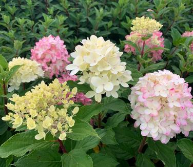 Limelight Prime® (‘SMNHPH’) Hardy Hydrangea starts blooming in mid summer, producing cone-shaped lime green panicles which rapidly turn white. The habit of Hydrangea Limelight Prime® is more compact than the original Limelight®, and the stems are sturdier so the flowers do not flop after rains. As the summer temperatures cool, Limelight Prime® takes on shades of rose pink. The seedheads are tan and an interesting addition in winter. The cold tolerance and compact habit make this a good candidate for large containers.