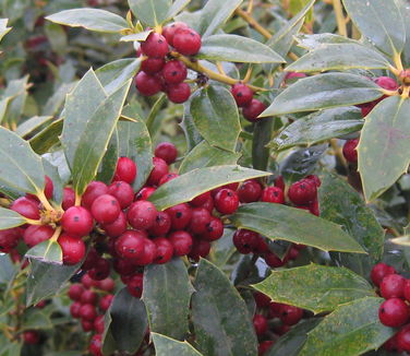 'Christmas Jewel' ('HL10-90') Holly is a small pyramidal female Ilex with abundant large red fruit at a very young age. Narrow dark shiny evergreen leaves, does not need a pollinator. It was introduced by Bob Head of Head-Lea Nursery.