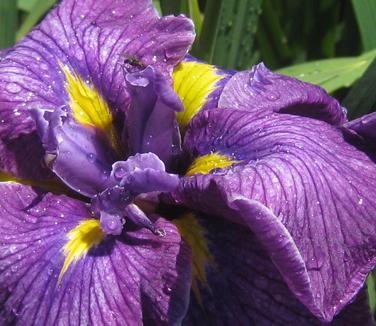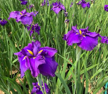 'Happy Awakening' Japanese Iris blooms in June, with flat magenta-pink flowers that have dark veins and contrasting yellow centers. The excellent wet site tolerance and the deer resistance make this a great garden or bog plant.