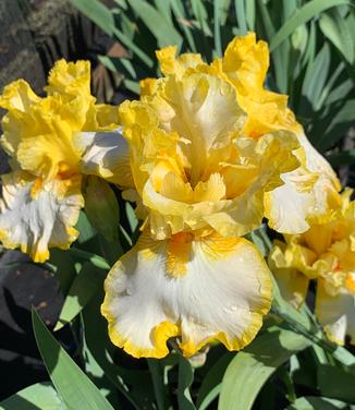 ‘Fringe of Gold’ German Bearded Iris blooms in May and June. The large showy flowers have bright white falls with wide yellow bands on the edges, and the standards are the same bright yellow. A welcome addition to the late spring garden, in sunny well-drained spots.