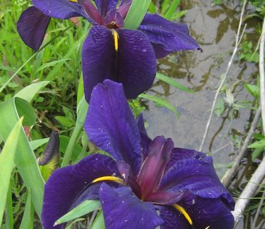 'Black Gamecock' True Water Iris has deep purple-black flowers in June over strap-like foliage. This Iris loves water and warm temperatures and does very well in bogs and on the edges of ponds.