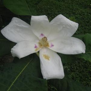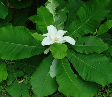 Bigleaf Magnolia has large creamy white single flowers in spring and big rose-colored fruits in summer. Magnolia macrophylla is well known for its huge tropical-looking leaves.