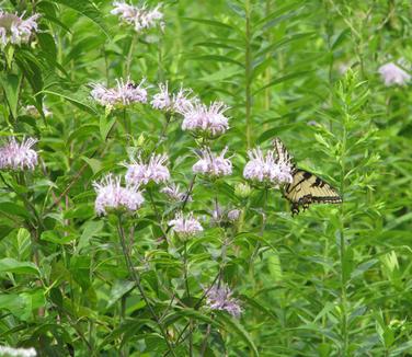 Wild Beramot is a lovely native perennial that thrives in prairie conditions and poor soil sites. The pinking lavender tube-like flowers are held in a circle around the bracts, and persist through mid to late summer. The aromatic foliage is deer resistant and smells minty when brushed against. Monarda fistulosa is a good addition to wild flower gardens and prairie gardens. Wild Bergamot is a reliable self-seeder and a wonderful butterfly and hummingbird attractor. Attracts many pollinators, including clearwing hawk moths.