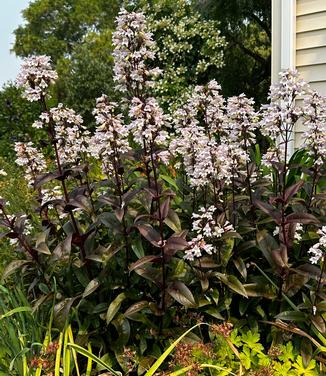 ‘Onyx and Pearls’ Beardtongue comes from Walters Gardens’ breeding program of new beauties. Penstemon digitalis ‘Onyx and Pearls’ is a taller, darker version of this adaptable native, with burgundy foliage and stems which are almost black. The white and pale lavender flower clumps are on tall clusters made even more striking by their black stems. ‘Onyx and Pearls’ blooms for a long period in early to mid summer, and makes an excellent cut flower. The beautiful dark foliage makes a showy rosette well into early winter. Pollinators like bumblebees, swallowtail butterflies, and ruby-throated hummingbirds are attracted to these native plants.