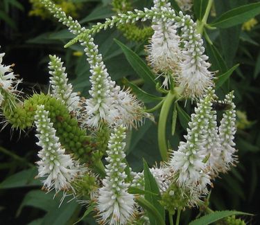 Culvers Root has tall white spires of Veronica-like flowers in July and August. It tolerates wet sites very well. There's an amazing patch of Veronicastrum virginicum at the Scott Arboretum in full bloom during the Woody Plant Conference in July. It's worth a visit. A pollinator favorite.