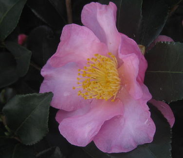 Camellia x 'Long Island Pink' has single pink flowers that bloom in the fall and a nice compact habit. 'Long Island Pink' Camellia was found on Long Island, NY and is evergreen.