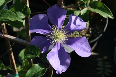 'General Sikorski' Clematis is a vigorous climbing vine with large lavender blue flowers set off by soft yellow stamens. Clematis 'General Sikorski' starts blooming in late spring and continues throughout June. Like a number of other Clematis, 'General Sikorski' will often rebloom in late summer and early fall. This vigorous vine needs something to cling to, so plant it with a trellis or beside a shrub which it can grow up through.
